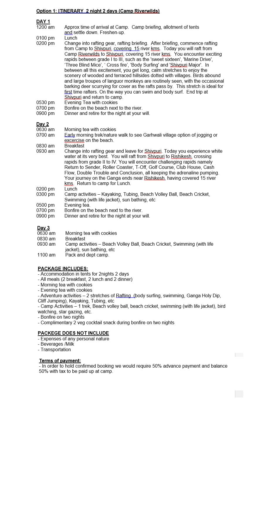 ITINERARY – 2 Night 2 days (Camp Riverwilds)